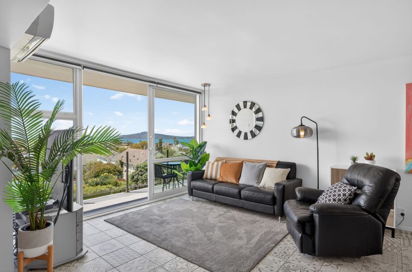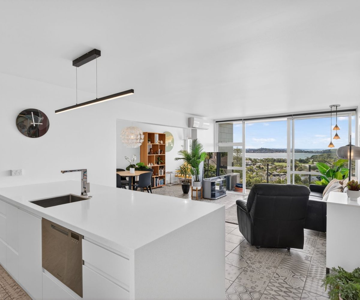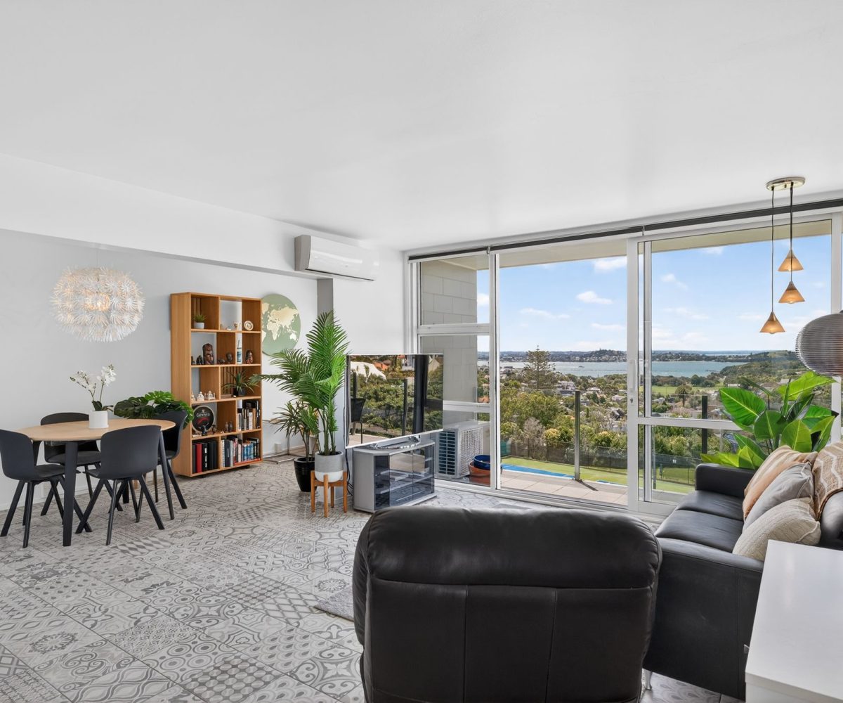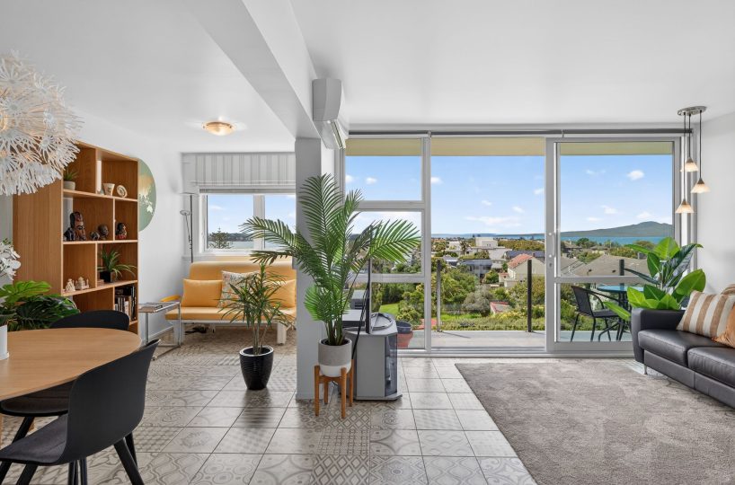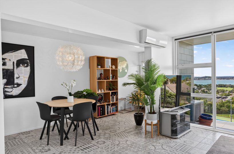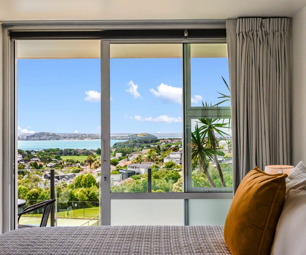 Perched high on the fifth floor, this beautifully maintained one-bedroom apartment delivers sweeping panoramic views that stretch from the Waitākere Ranges across the city skyline, Rangitoto and out to Hunua Ranges – views you’ll never tire of waking up to.