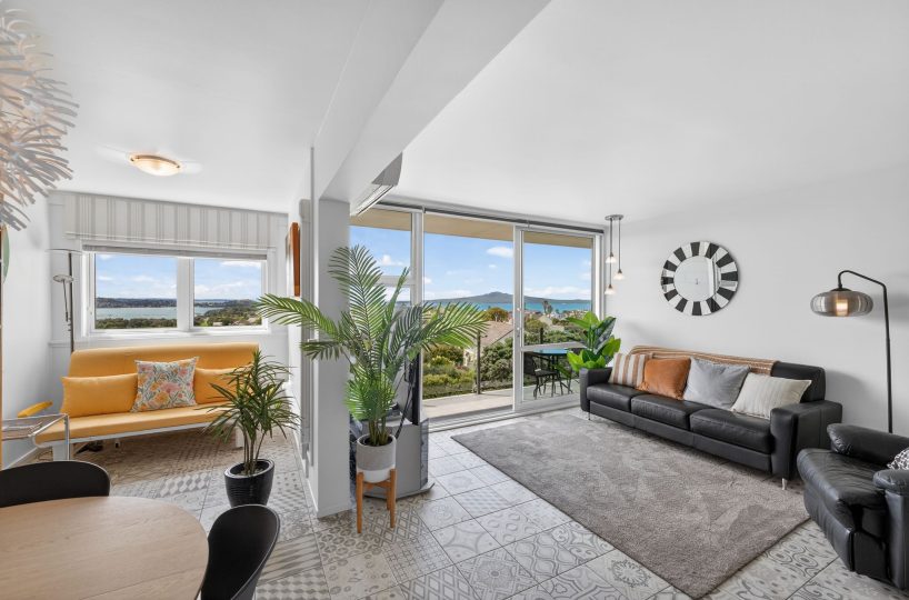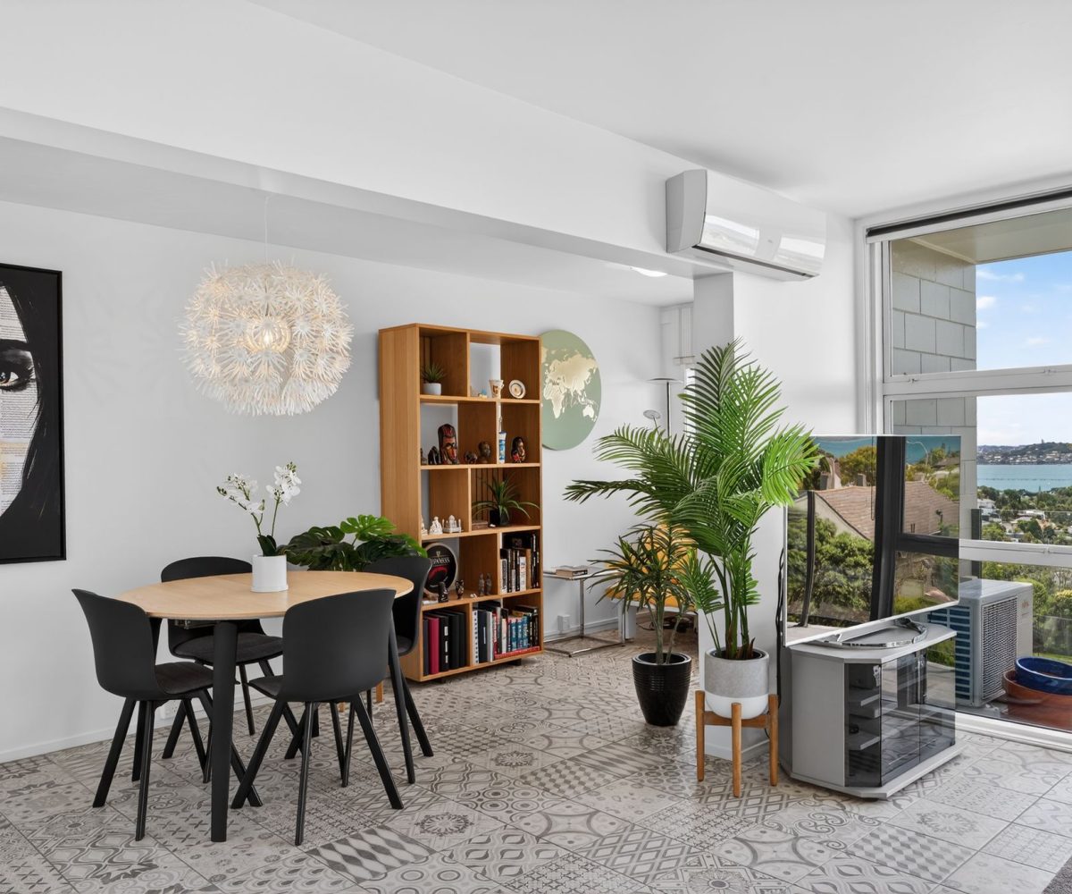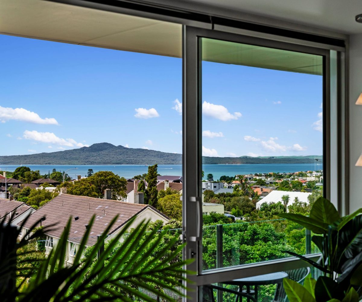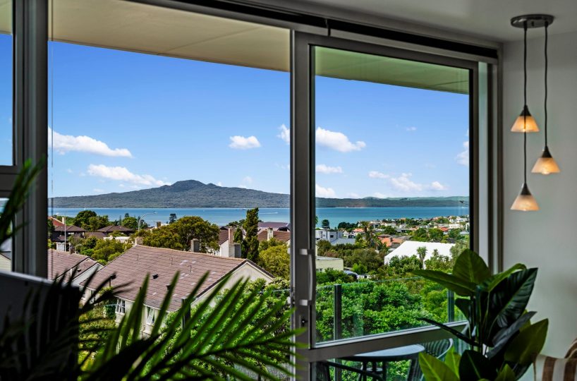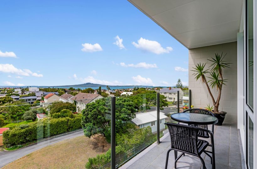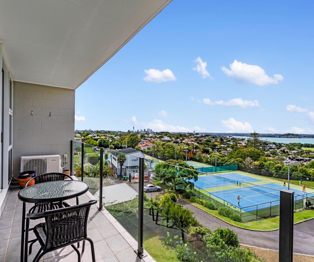 Perched high on the fifth floor, this beautifully maintained one-bedroom apartment delivers sweeping panoramic views that stretch from the Waitākere Ranges across the city skyline, Rangitoto and out to Hunua Ranges – views you’ll never tire of waking up to.