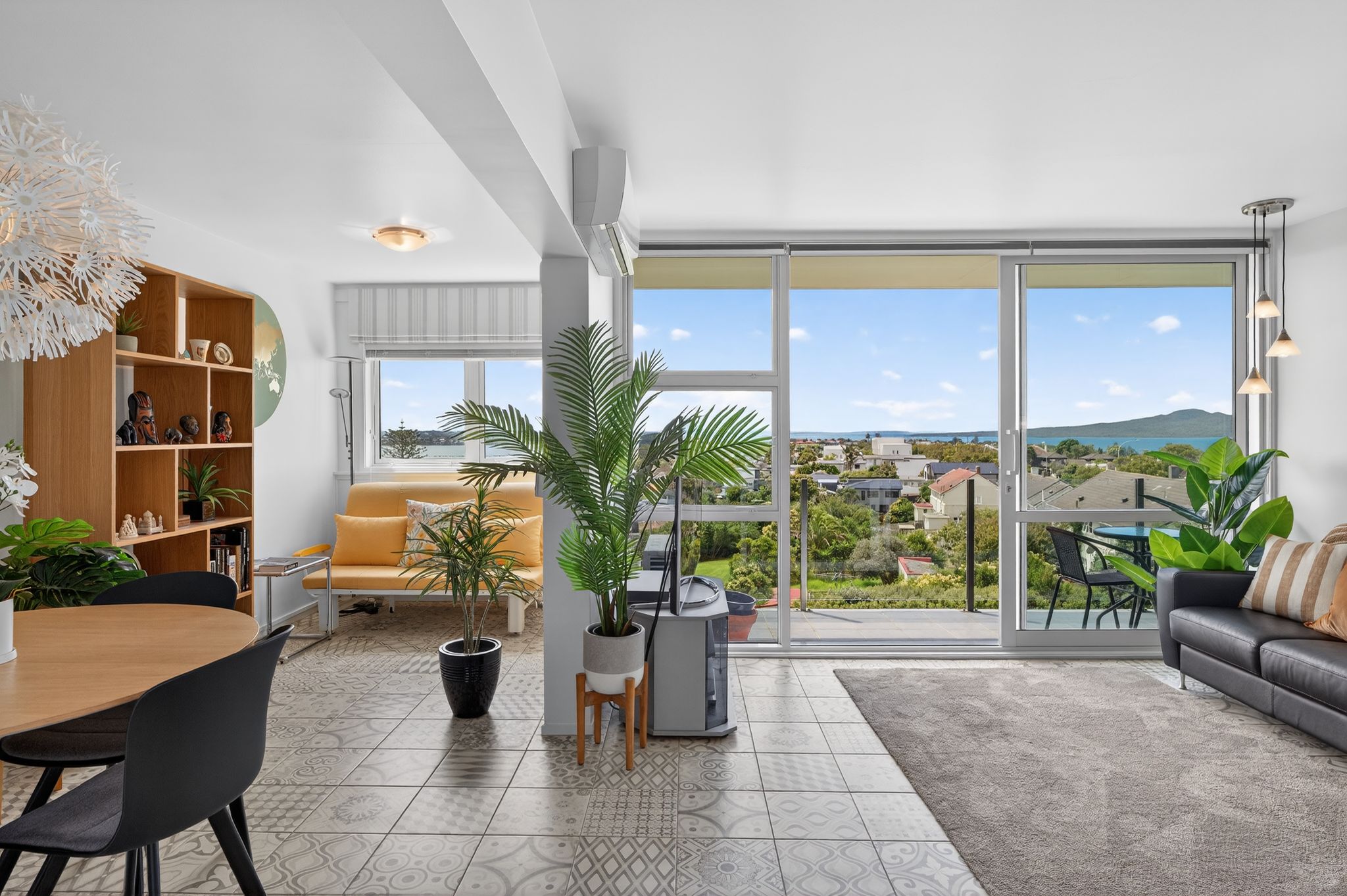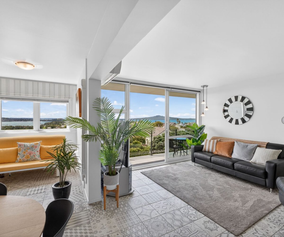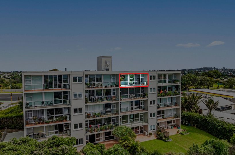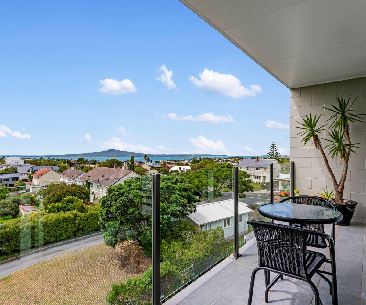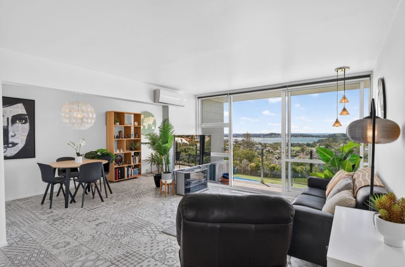 Perched high on the fifth floor, this beautifully maintained one-bedroom apartment delivers sweeping panoramic views that stretch from the Waitākere Ranges across the city skyline, Rangitoto and out to Hunua Ranges – views you’ll never tire of waking up to.