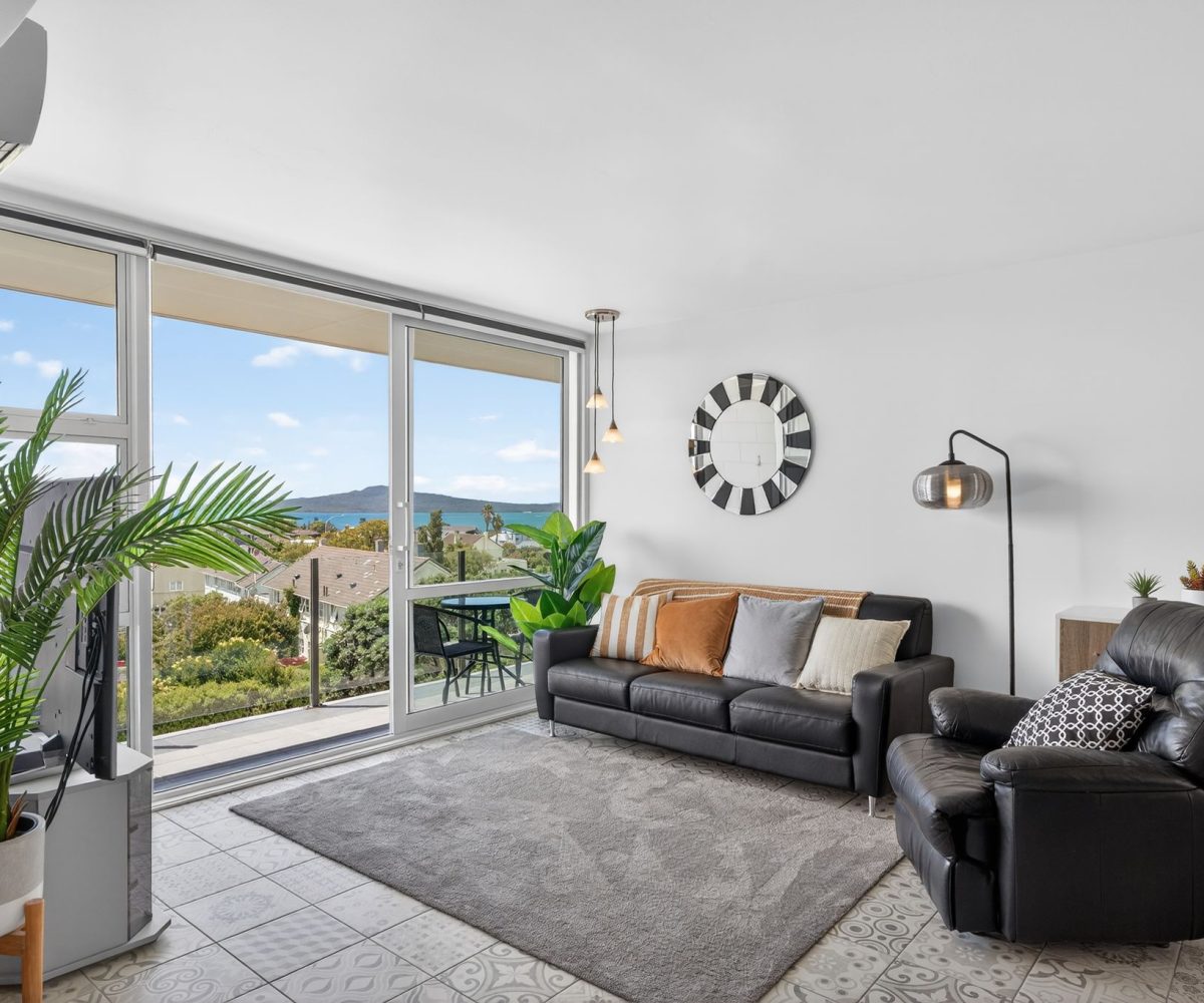 The generous 77m² floor plan features an open-plan kitchen, dining and living area, designed to capture both space and light, creating an effortless flow for everyday living or entertaining. Every angle has been carefully considered, and the outlook is nothing short of spectacular. Both the living and the bedroom open out to a glassed-in balcony; the bathroom has been stylishly updated with a rare and luxurious touch. A secure off-street carpark is included – and the building itself is well cared for, recently repainted, and offers secure access and peace of mind.
