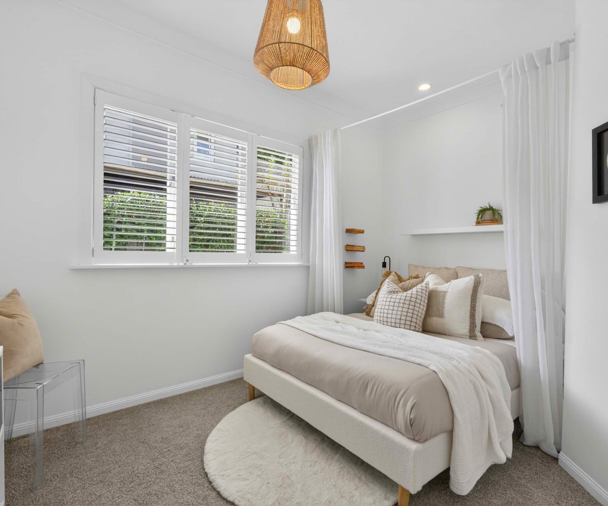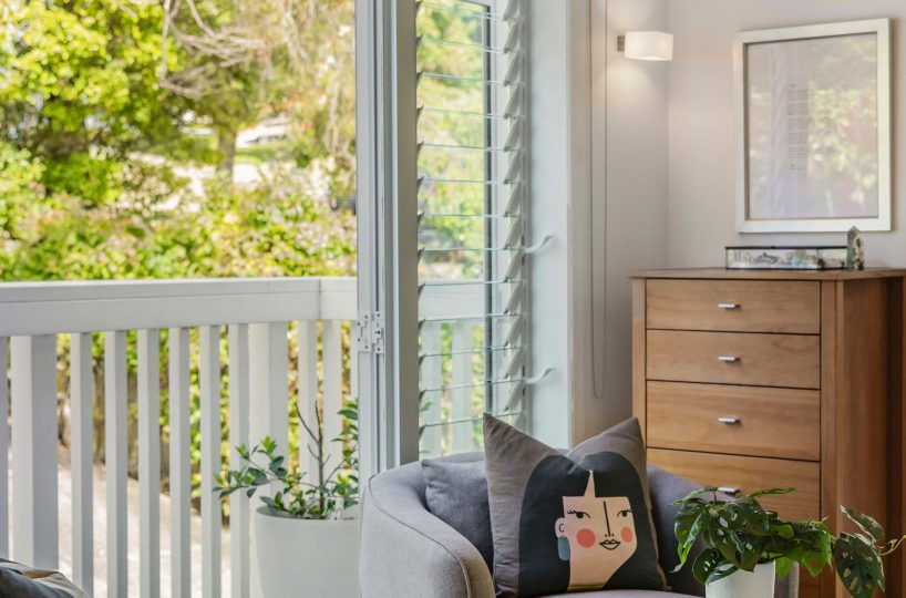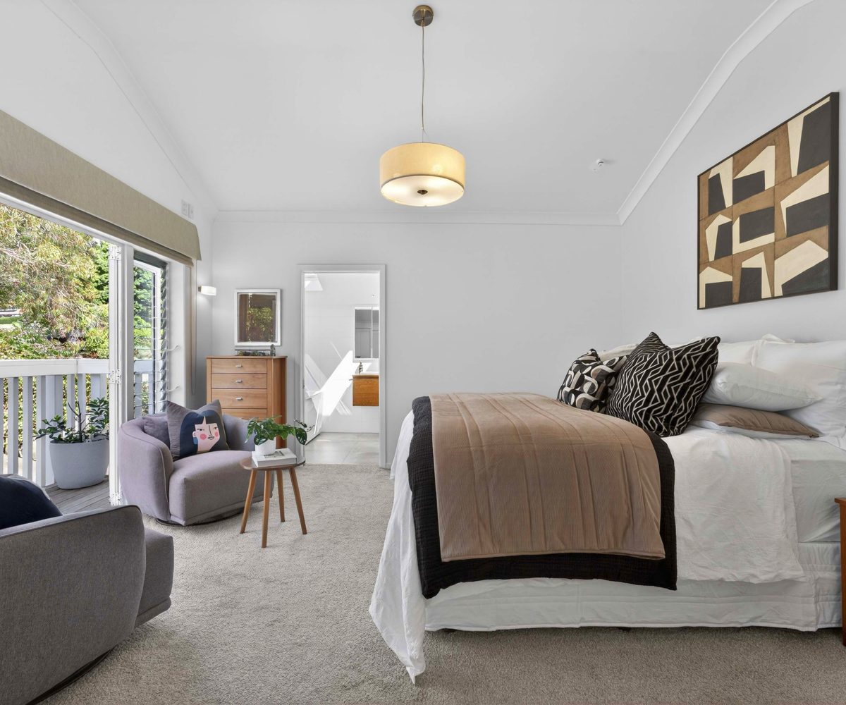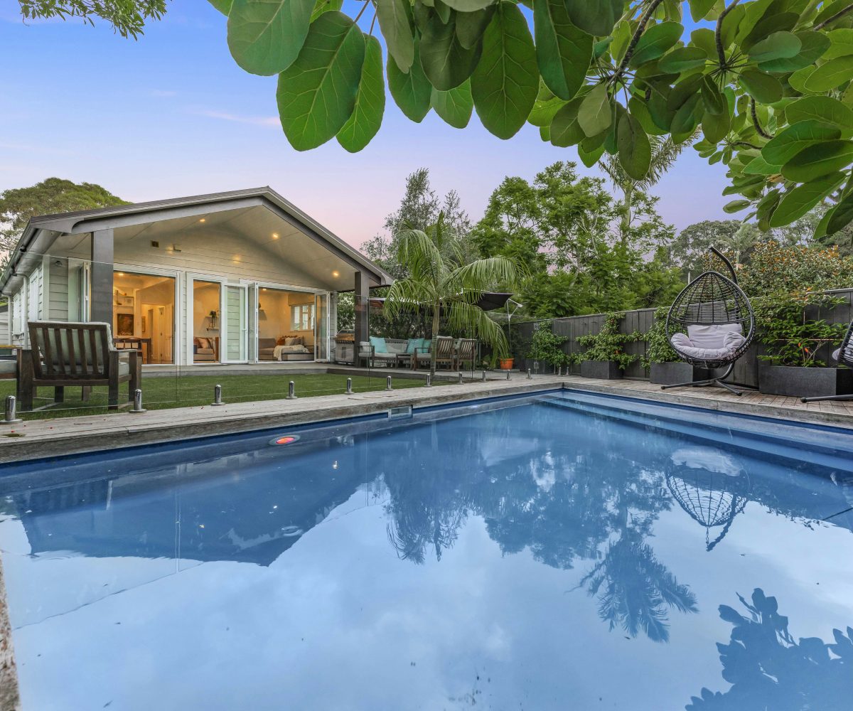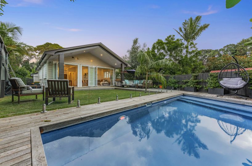 A vibrant yellow front door invites you into the light-filled foyer, setting the tone for the warmth and character that flows throughout the home. Step inside and discover an open-plan living, kitchen and dining area that seamlessly connects you to the outdoors. Here, floor-to-ceiling windows bathe the space in natural light and frame picturesque views of landscaped gardens and the sparkling pool, basking in sunlight all day long. Three generous bedrooms provide restful retreats, with the master suite boasting an expansive en suite, large wardrobe space and a whimsical ‘Rapunzel’ balcony draped in flowing sheers – the perfect setting for morning coffee or sunset relaxation.