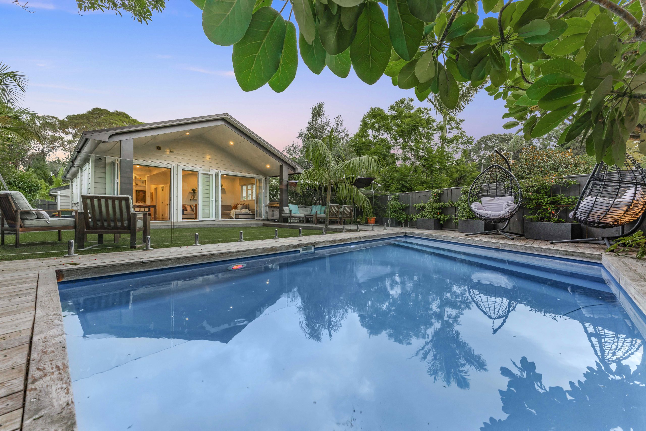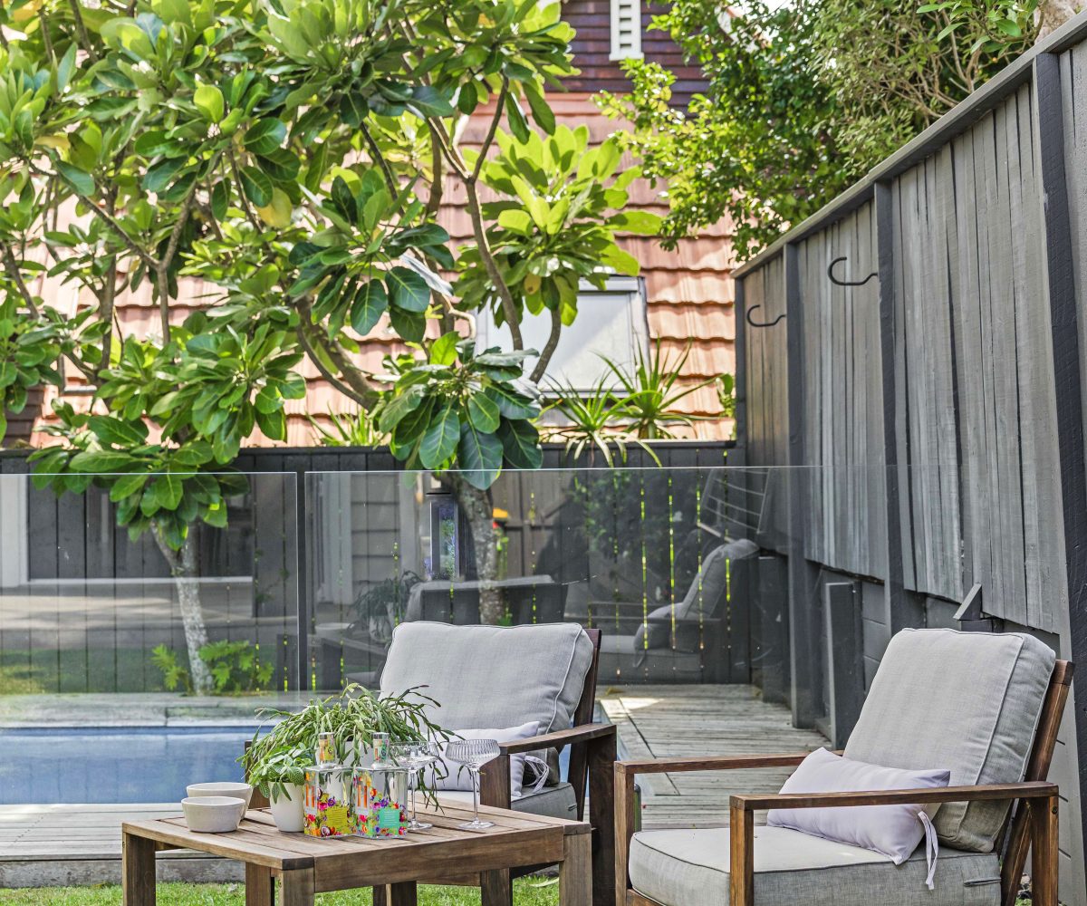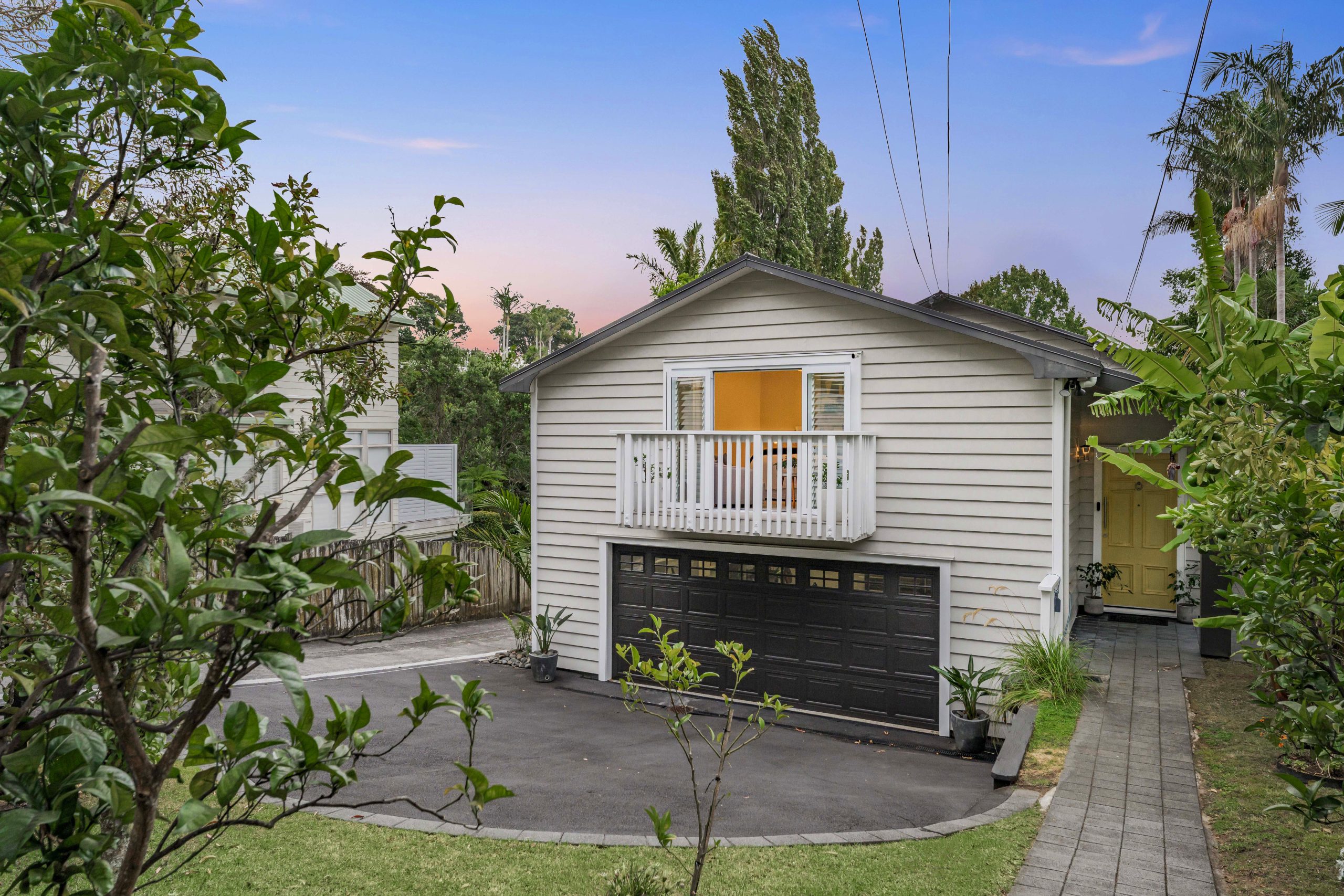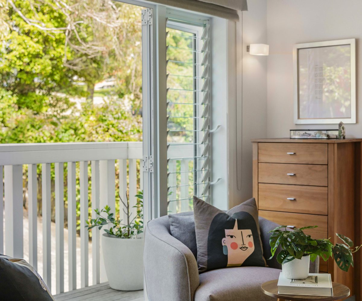 A vibrant yellow front door invites you into the light-filled foyer, setting the tone for the warmth and character that flows throughout the home. Step inside and discover an open-plan living, kitchen and dining area that seamlessly connects you to the outdoors. Here, floor-to-ceiling windows bathe the space in natural light and frame picturesque views of landscaped gardens and the sparkling pool, basking in sunlight all day long. Three generous bedrooms provide restful retreats, with the master suite boasting an expansive en suite, large wardrobe space and a whimsical ‘Rapunzel’ balcony draped in flowing sheers – the perfect setting for morning coffee or sunset relaxation.