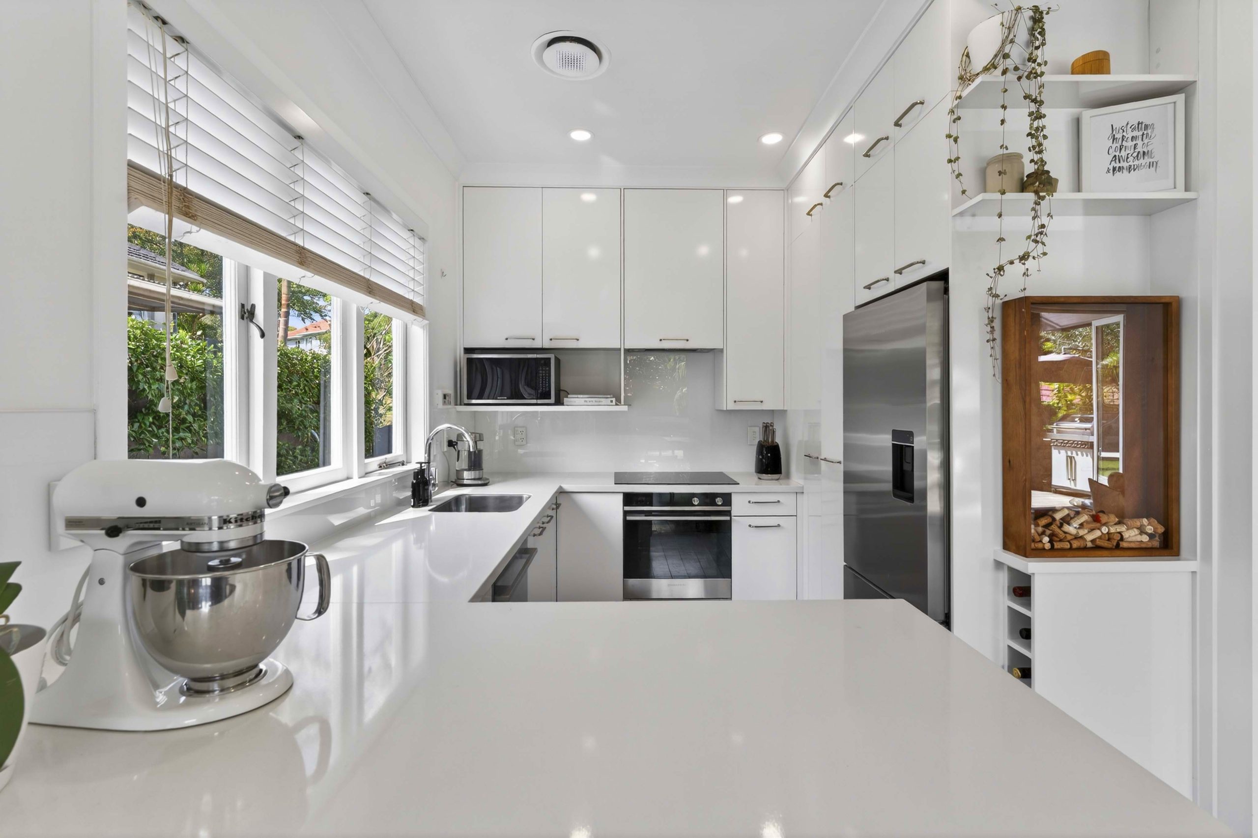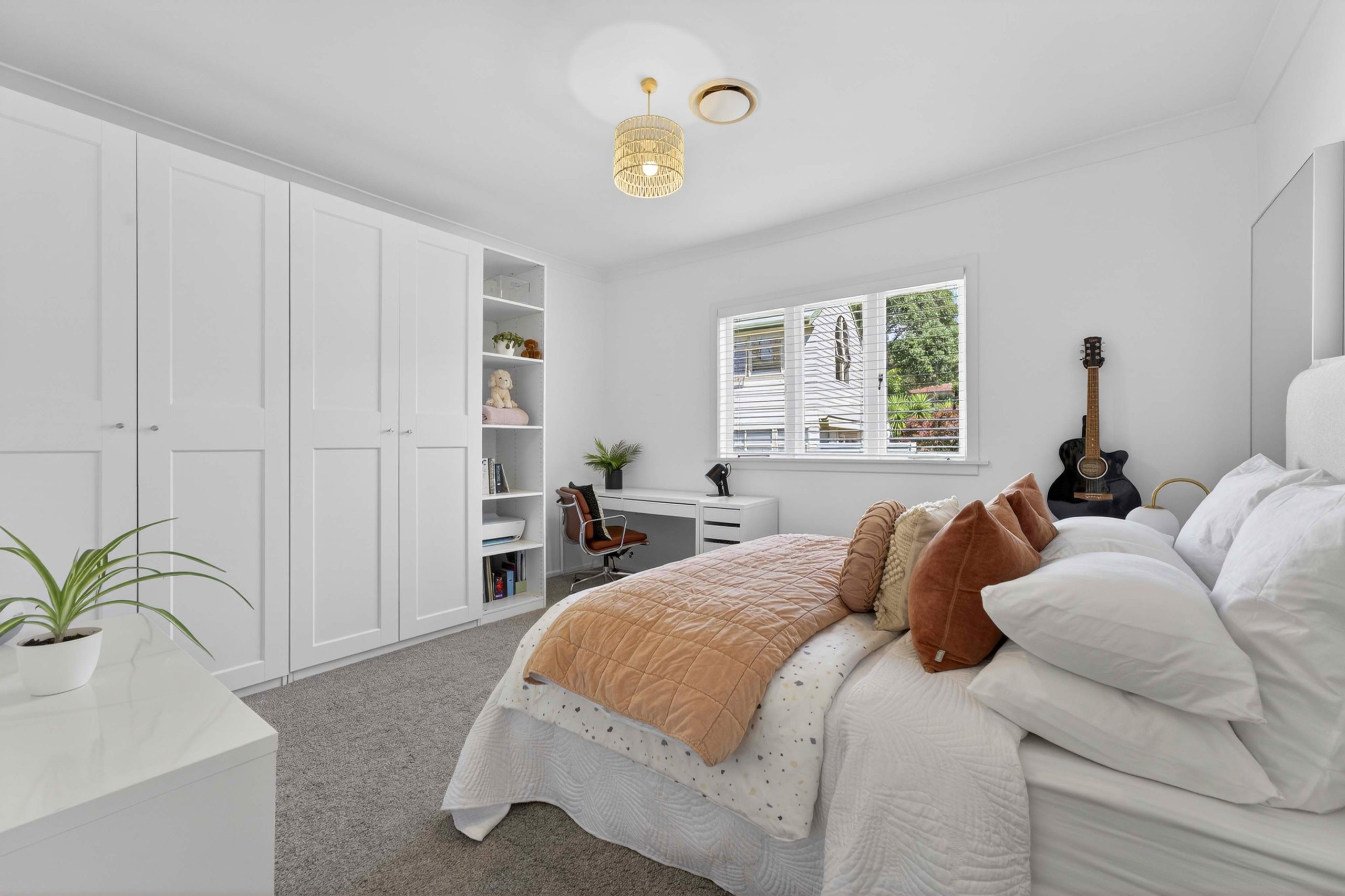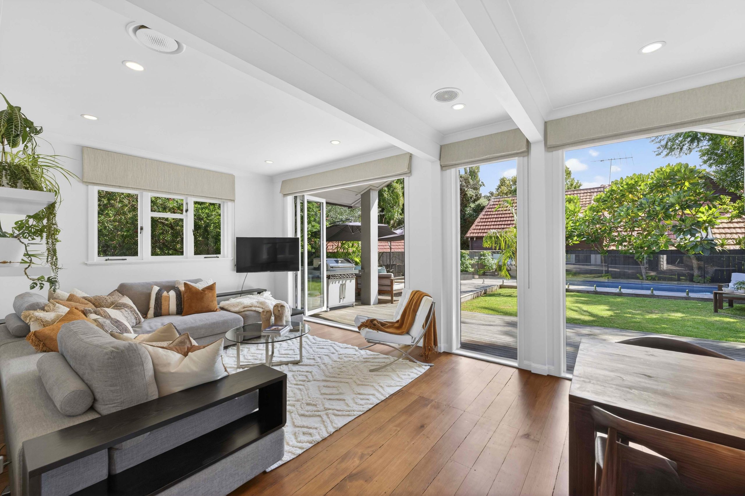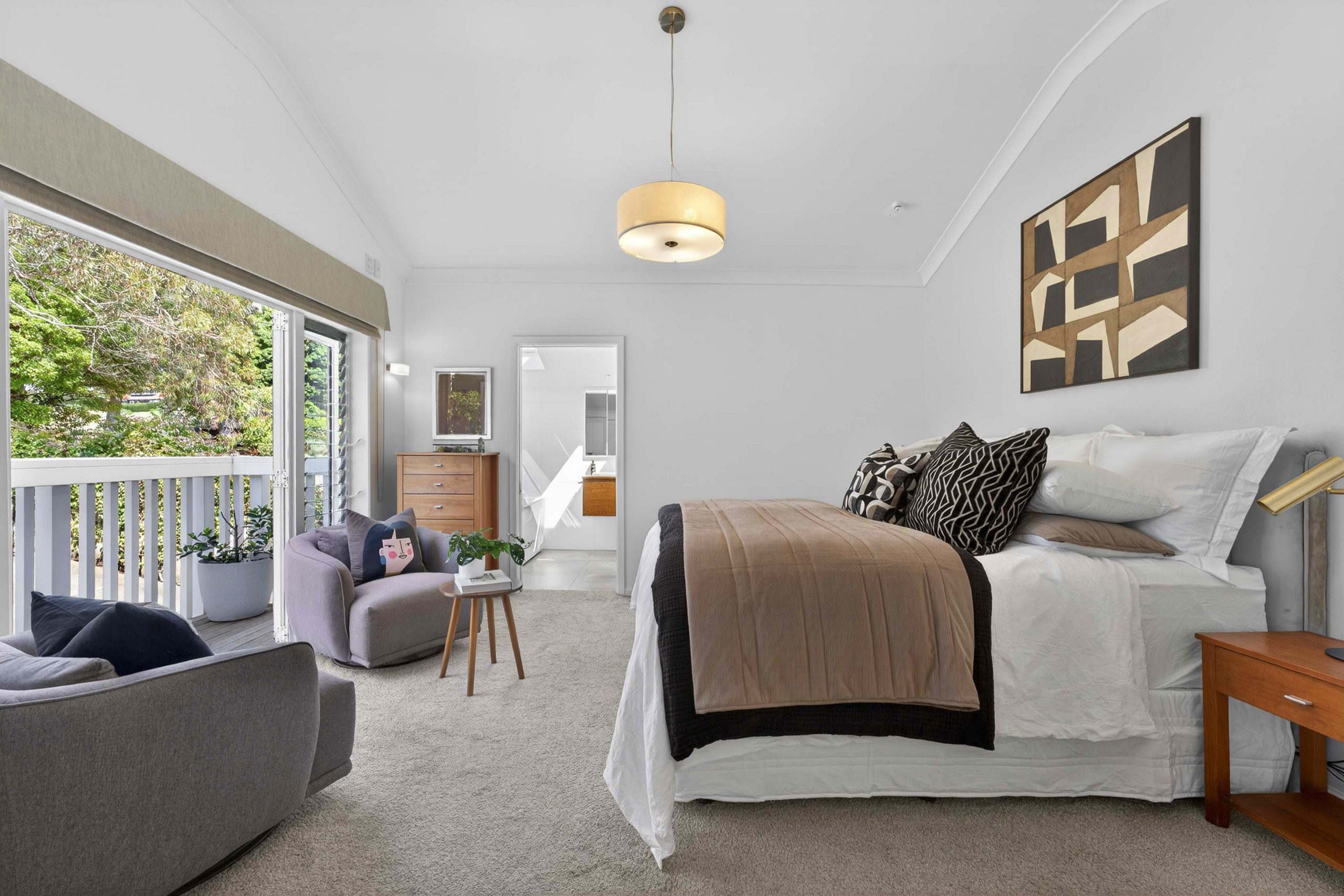 A vibrant yellow front door invites you into the light-filled foyer, setting the tone for the warmth and character that flows throughout the home. Step inside and discover an open-plan living, kitchen and dining area that seamlessly connects you to the outdoors. Here, floor-to-ceiling windows bathe the space in natural light and frame picturesque views of landscaped gardens and the sparkling pool, basking in sunlight all day long. Three generous bedrooms provide restful retreats, with the master suite boasting an expansive en suite, large wardrobe space and a whimsical ‘Rapunzel’ balcony draped in flowing sheers – the perfect setting for morning coffee or sunset relaxation.