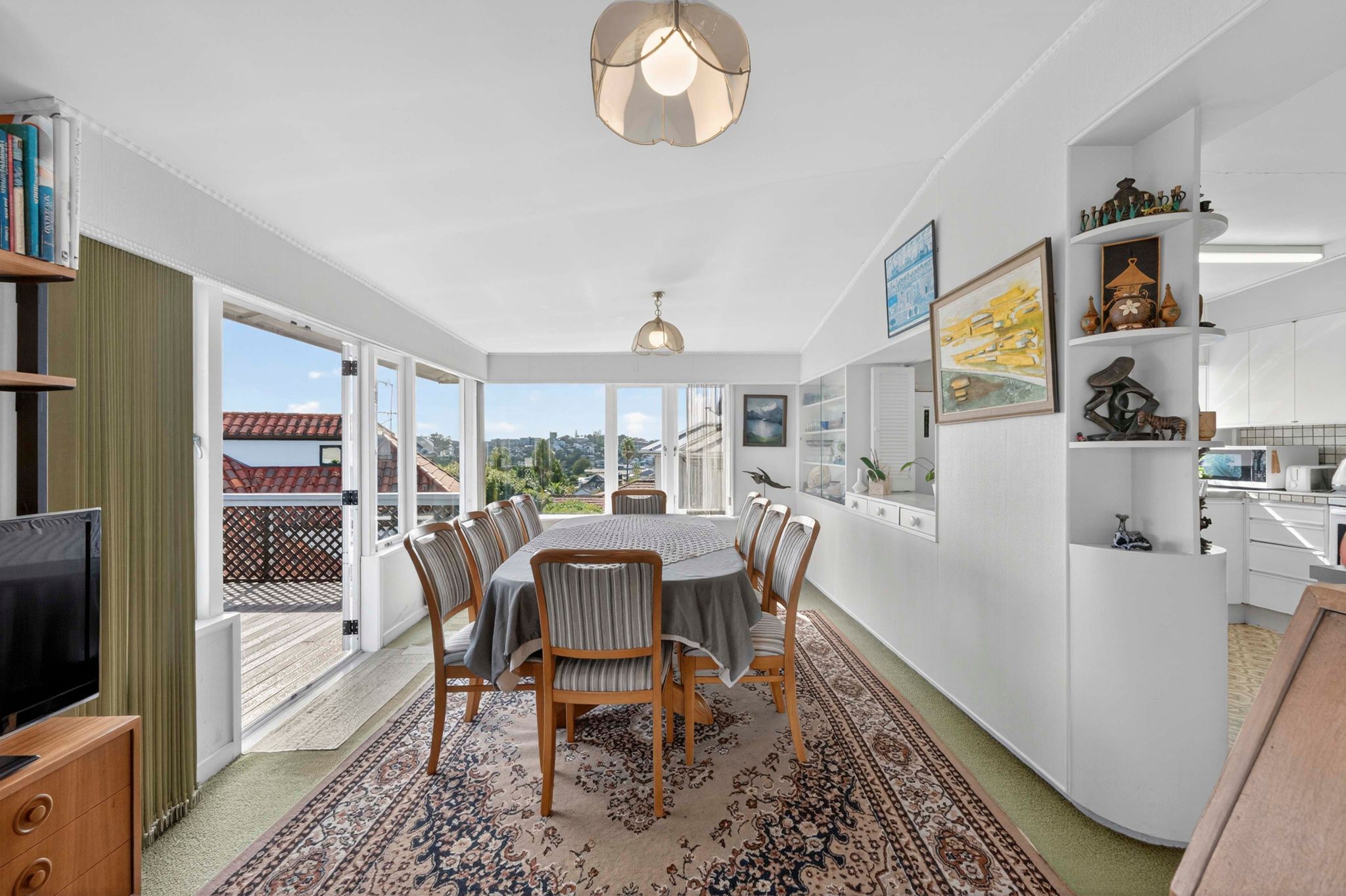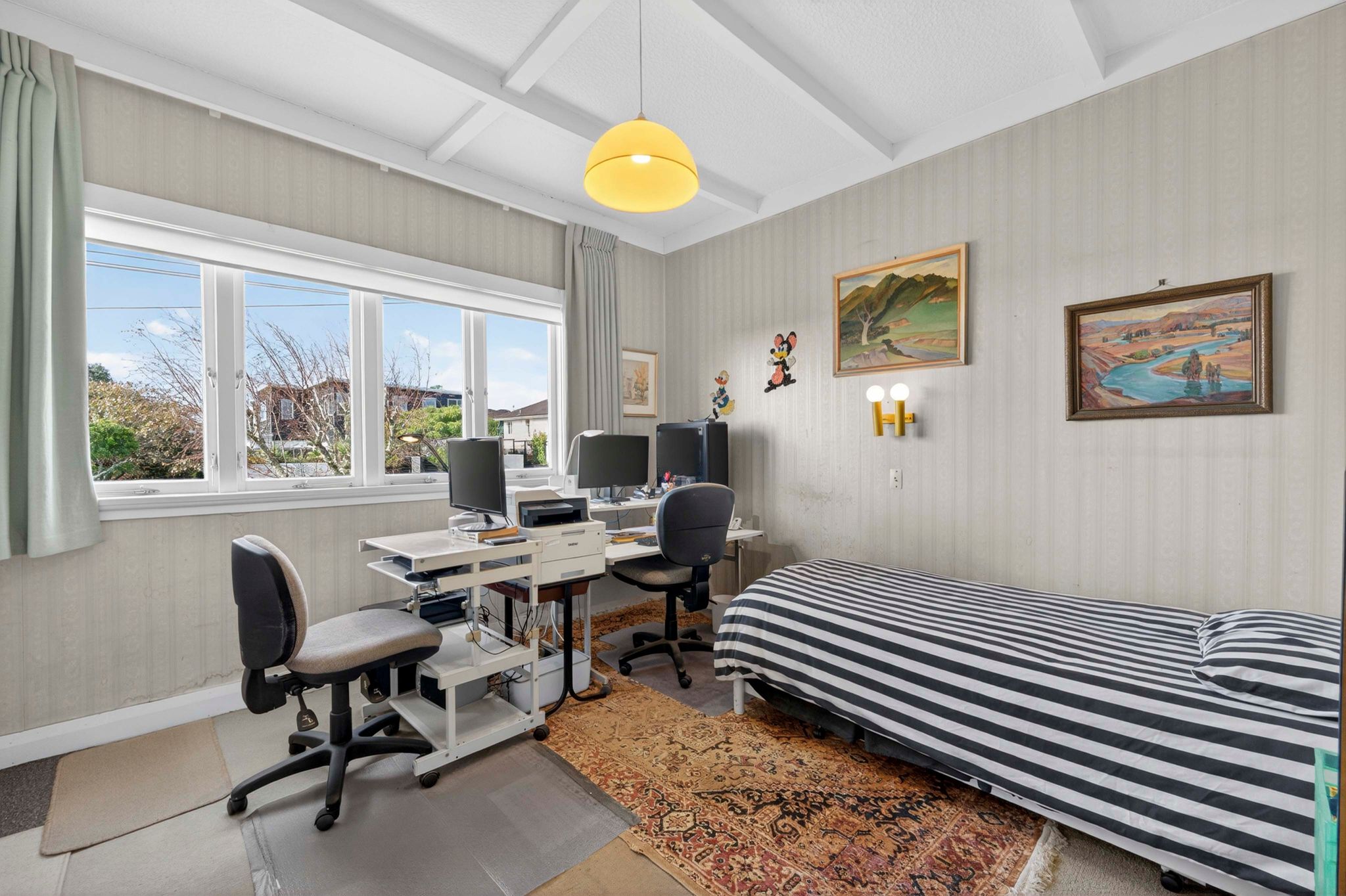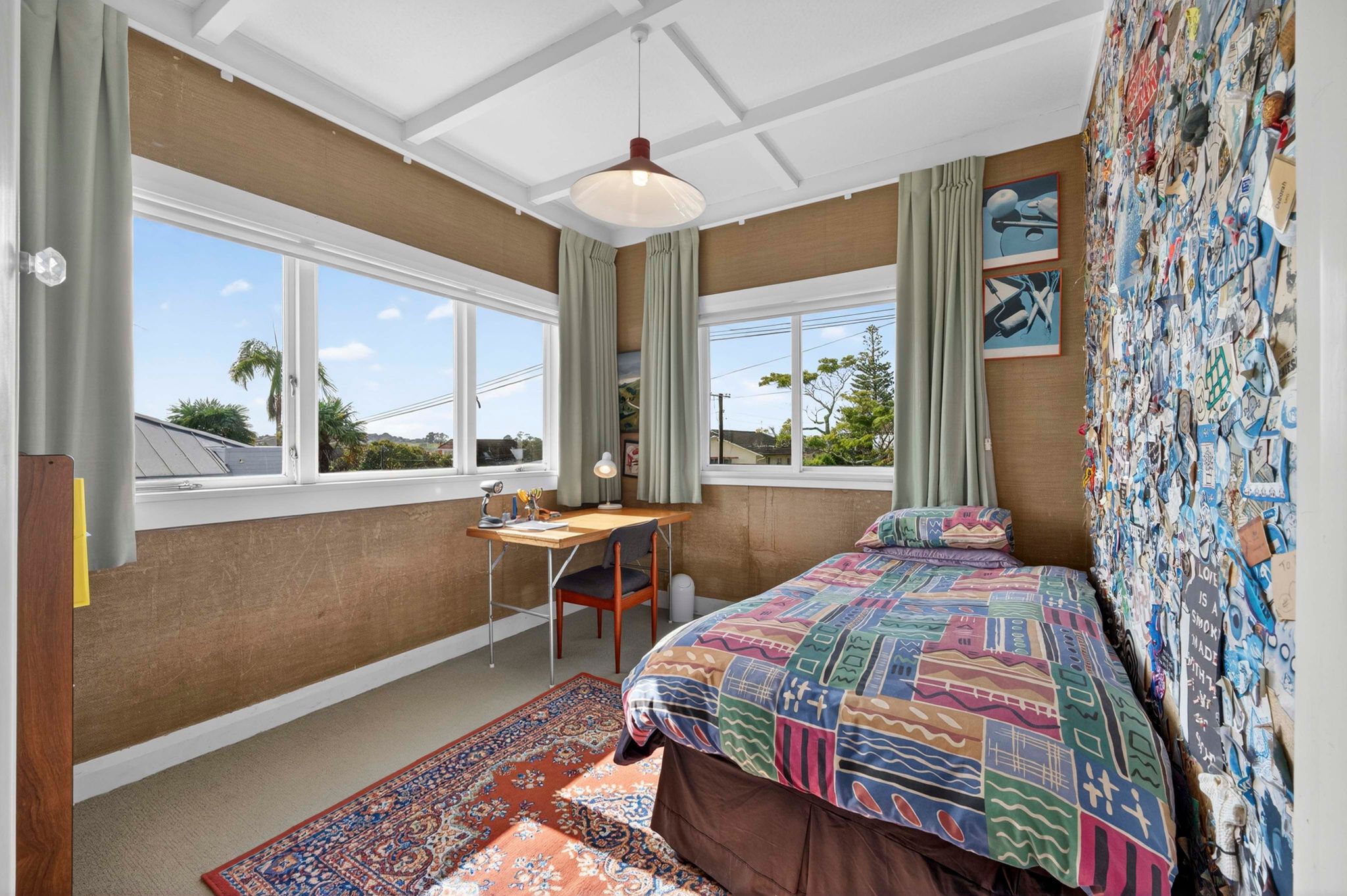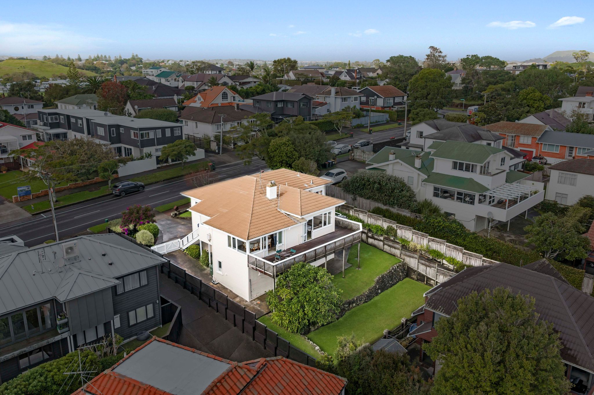 Spread across a substantial 184m² footprint with wide hallways, generous bathrooms (including a unique ‘throne room’ in the garage), and two separate living areas – ideal for families who cherish both connection and privacy. The kitchen flows seamlessly to the dining area and then into a sunny, north-facing living room, complete with a charming fireplace for those cosy winter evenings. Both areas open out to the wrap-around deck from where you can enjoy elevated views of Rangitoto. There are three spacious bedrooms, with the potential to create a fourth.